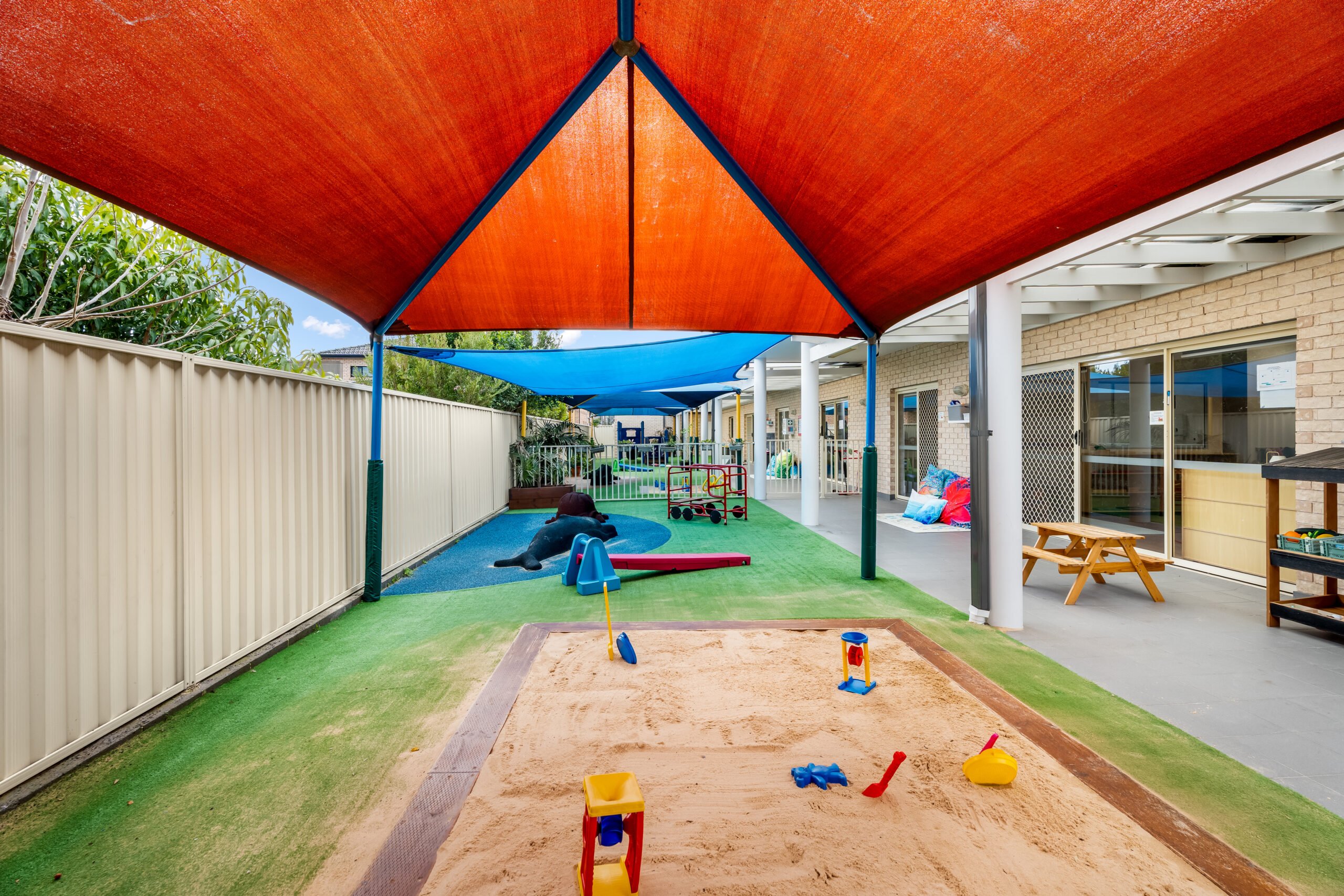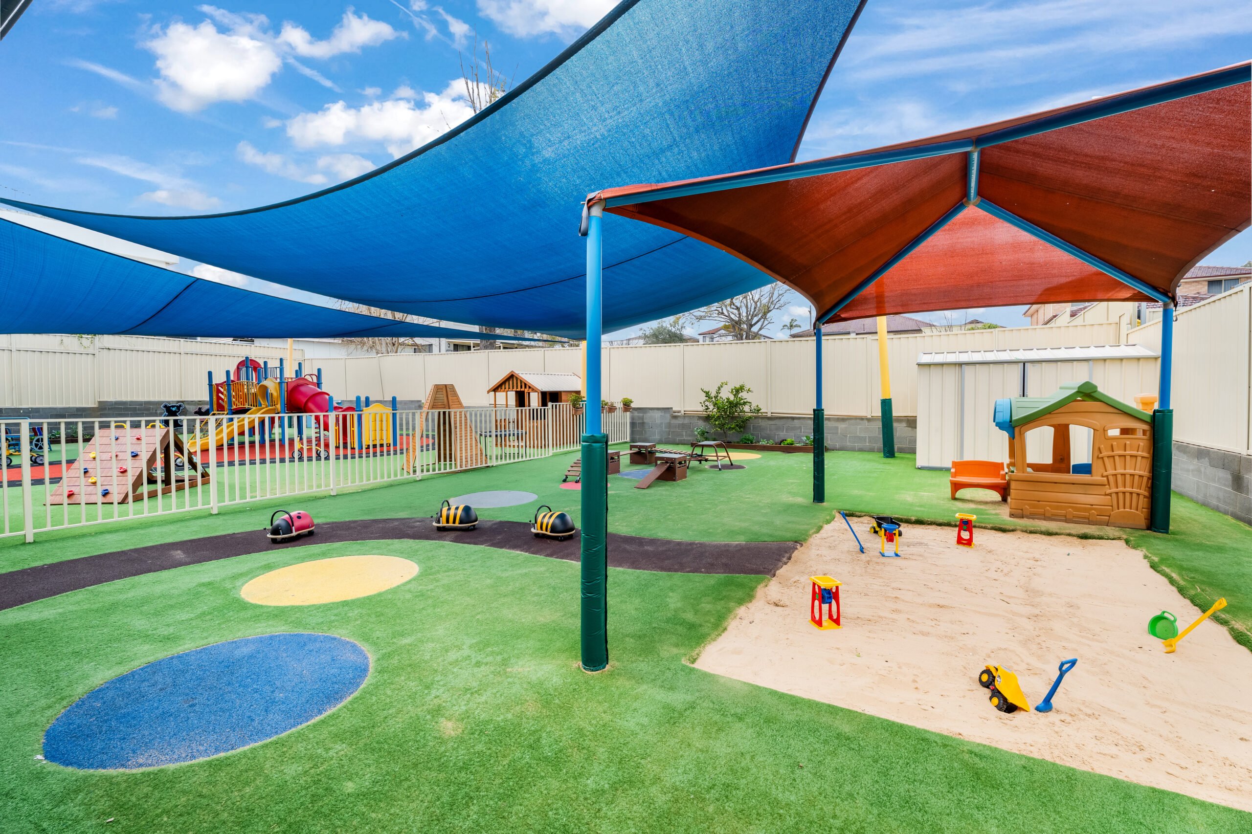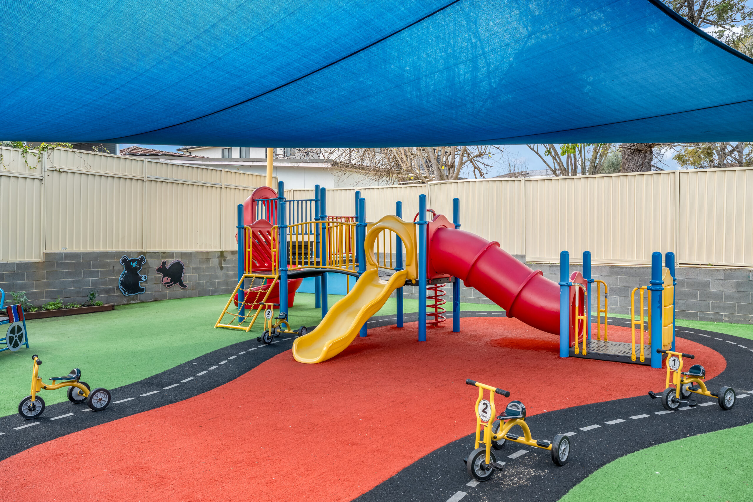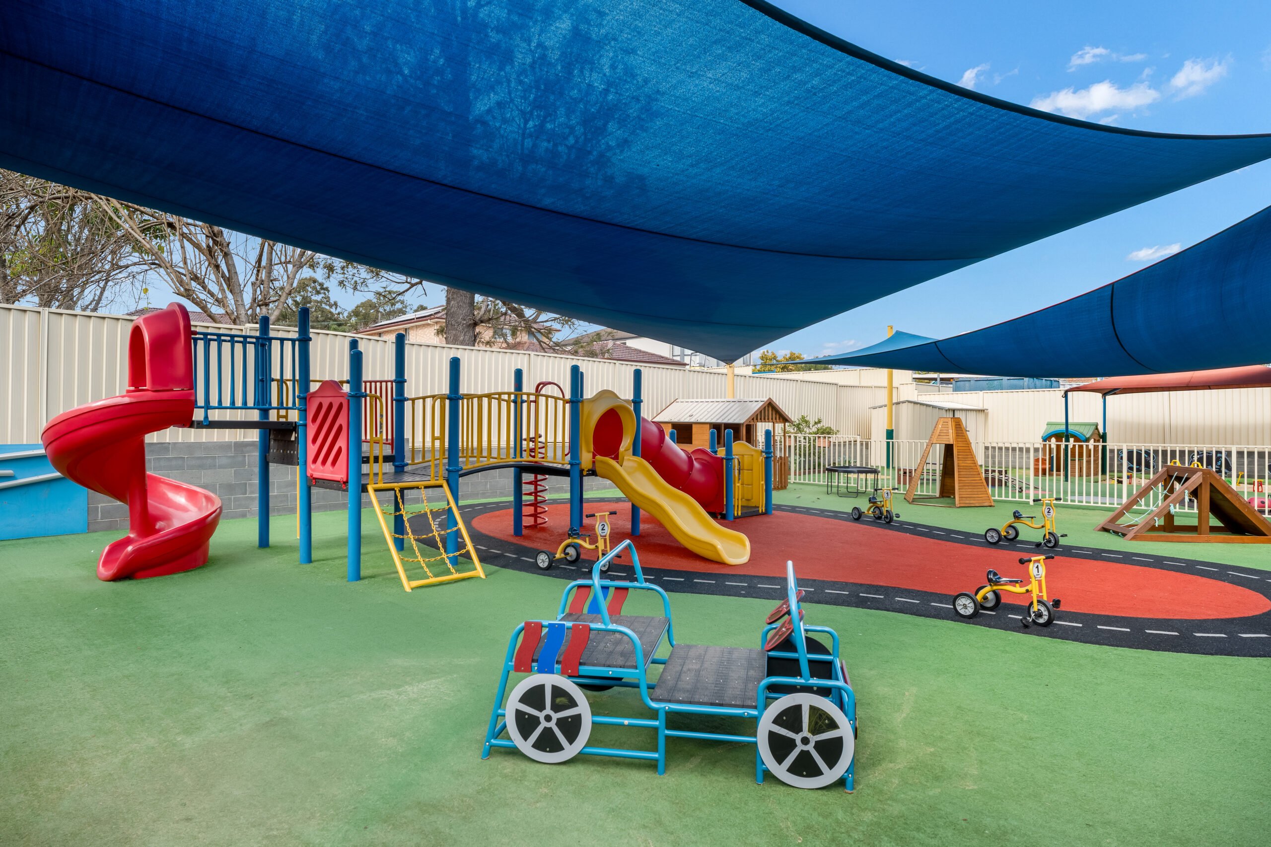 Beyond the classroom, our Auburn centre offers two vibrant outdoor play spaces filled with activities designed to encourage gross motor development and natural exploration through play. The 0-2 outdoor space features gardens, a sandpit, climbing equipment, soft-fall animals, cozy soft areas, water play, and plenty of room for little ones to crawl, walk, and run. For children aged 2-6, the outdoor area includes fixed equipment, a slide, bikes, a dramatic play corner, a cubby house, sandpit, gardens, water play, and so much more.