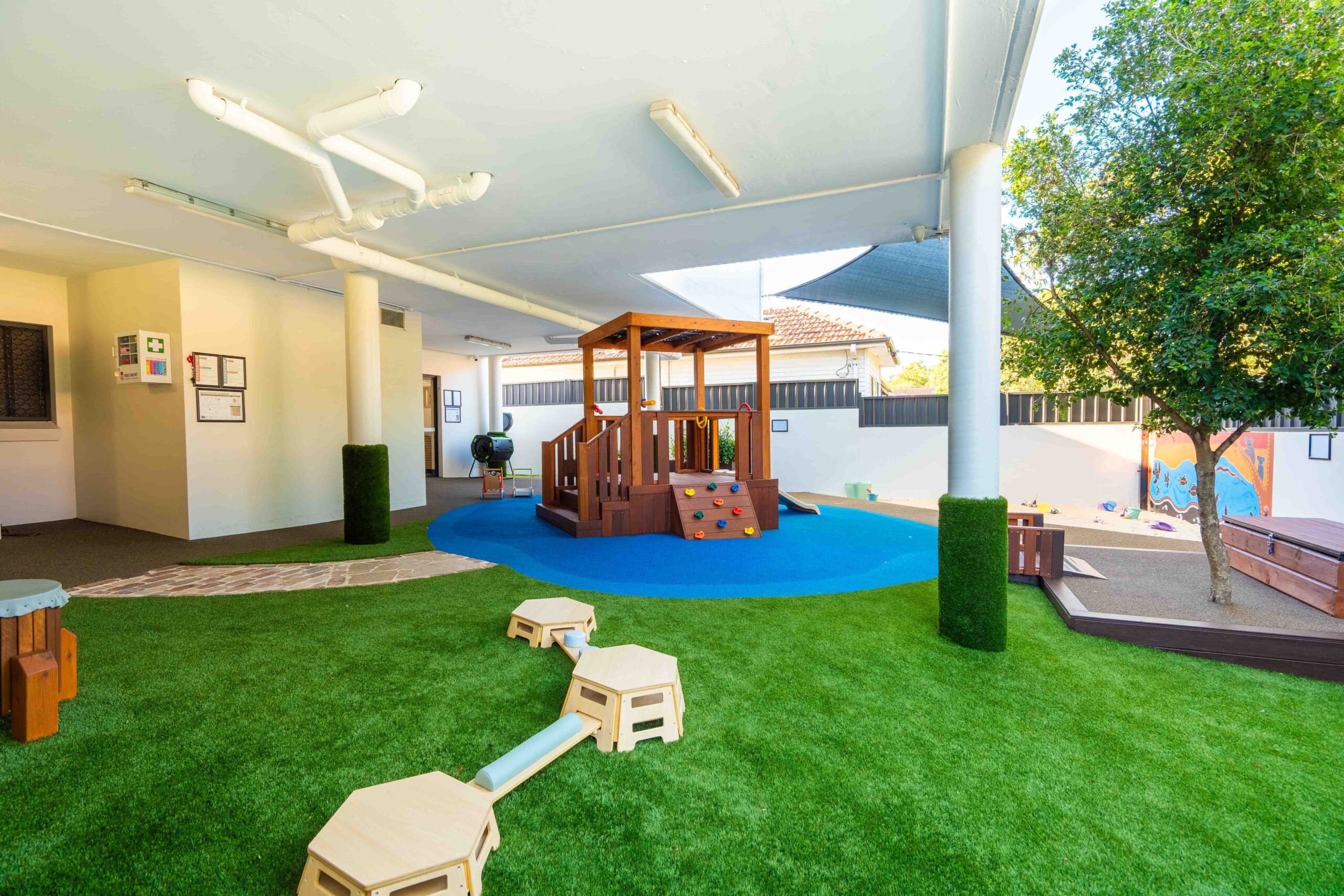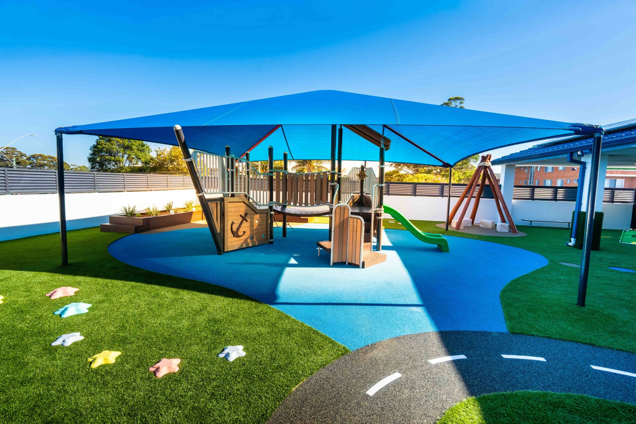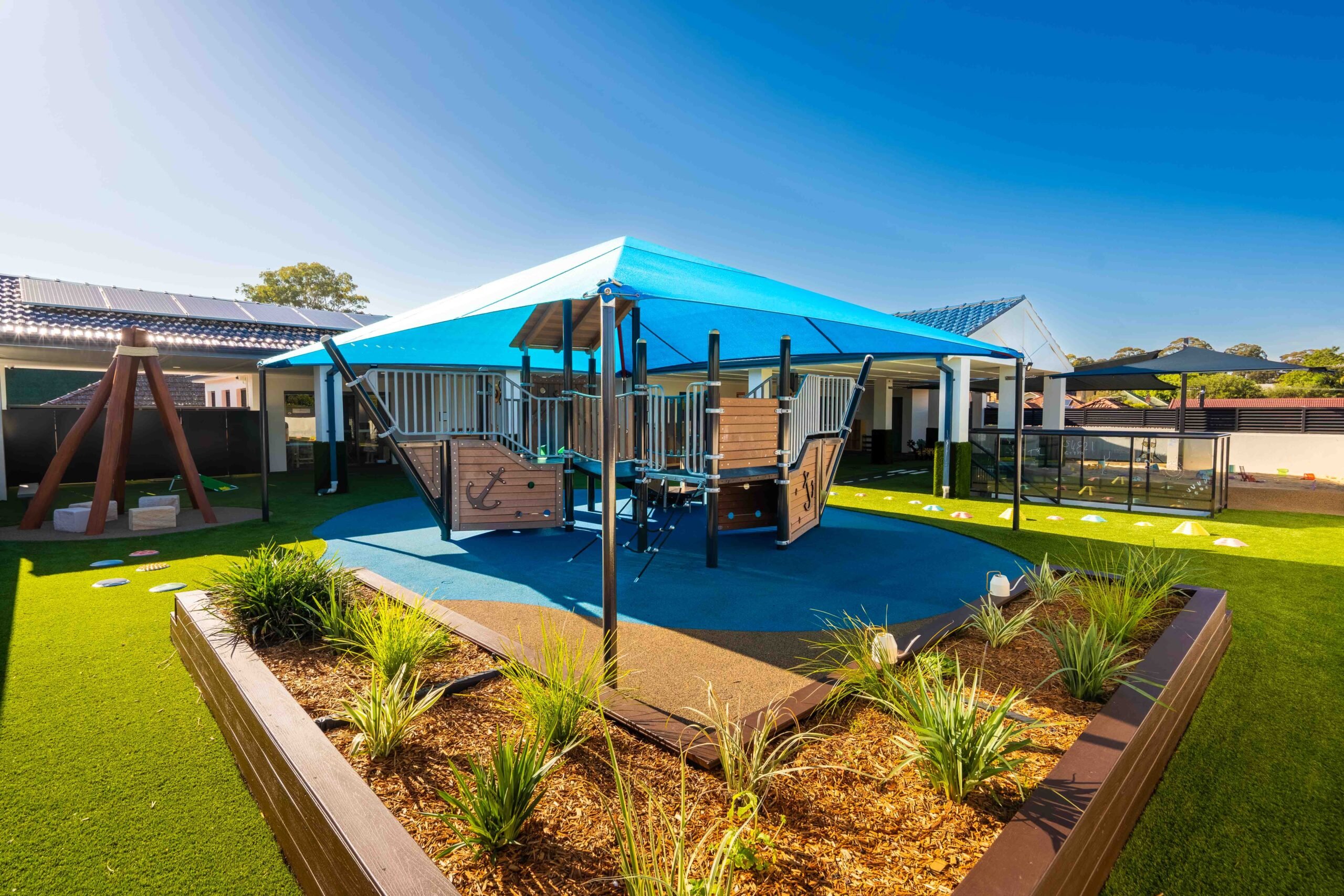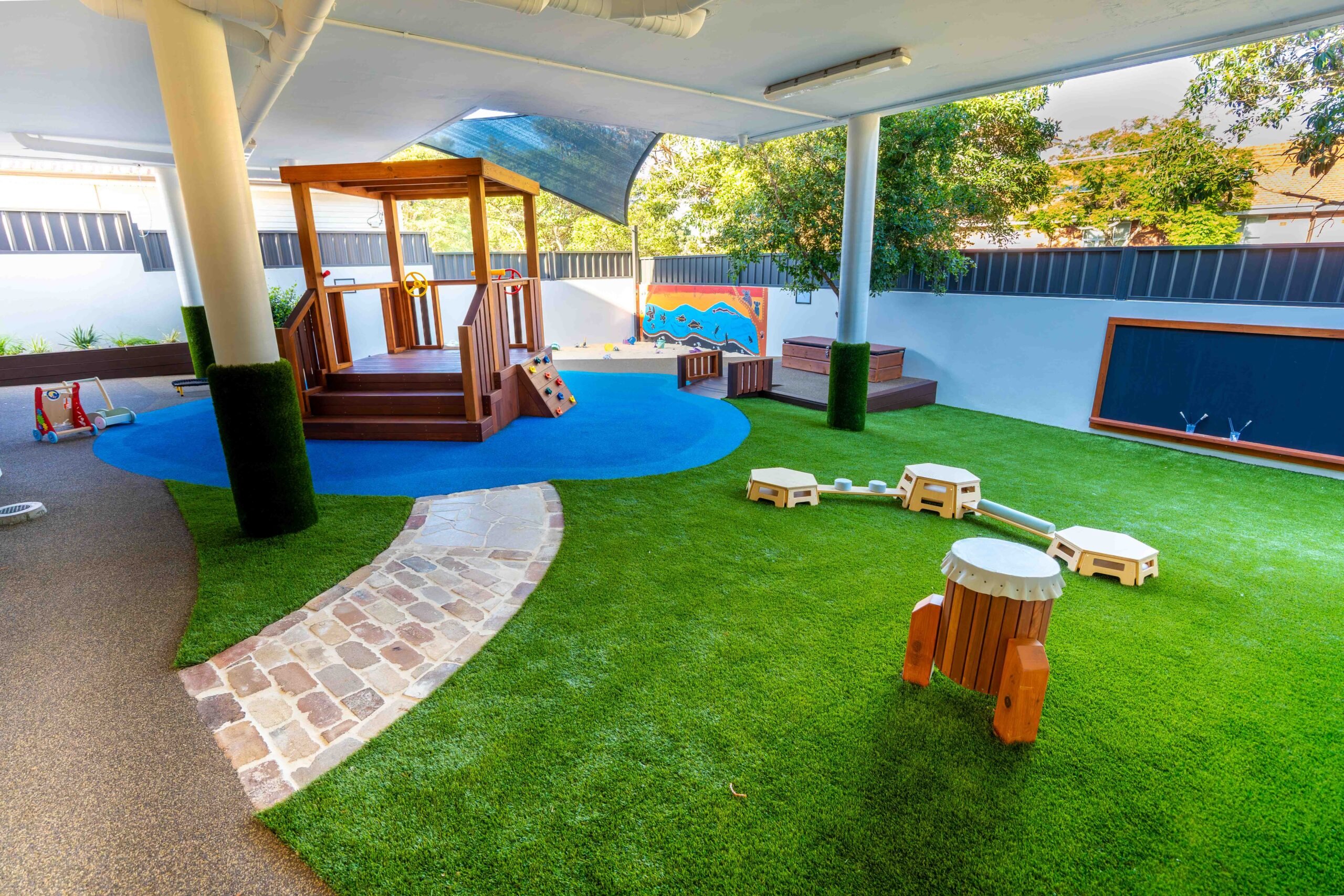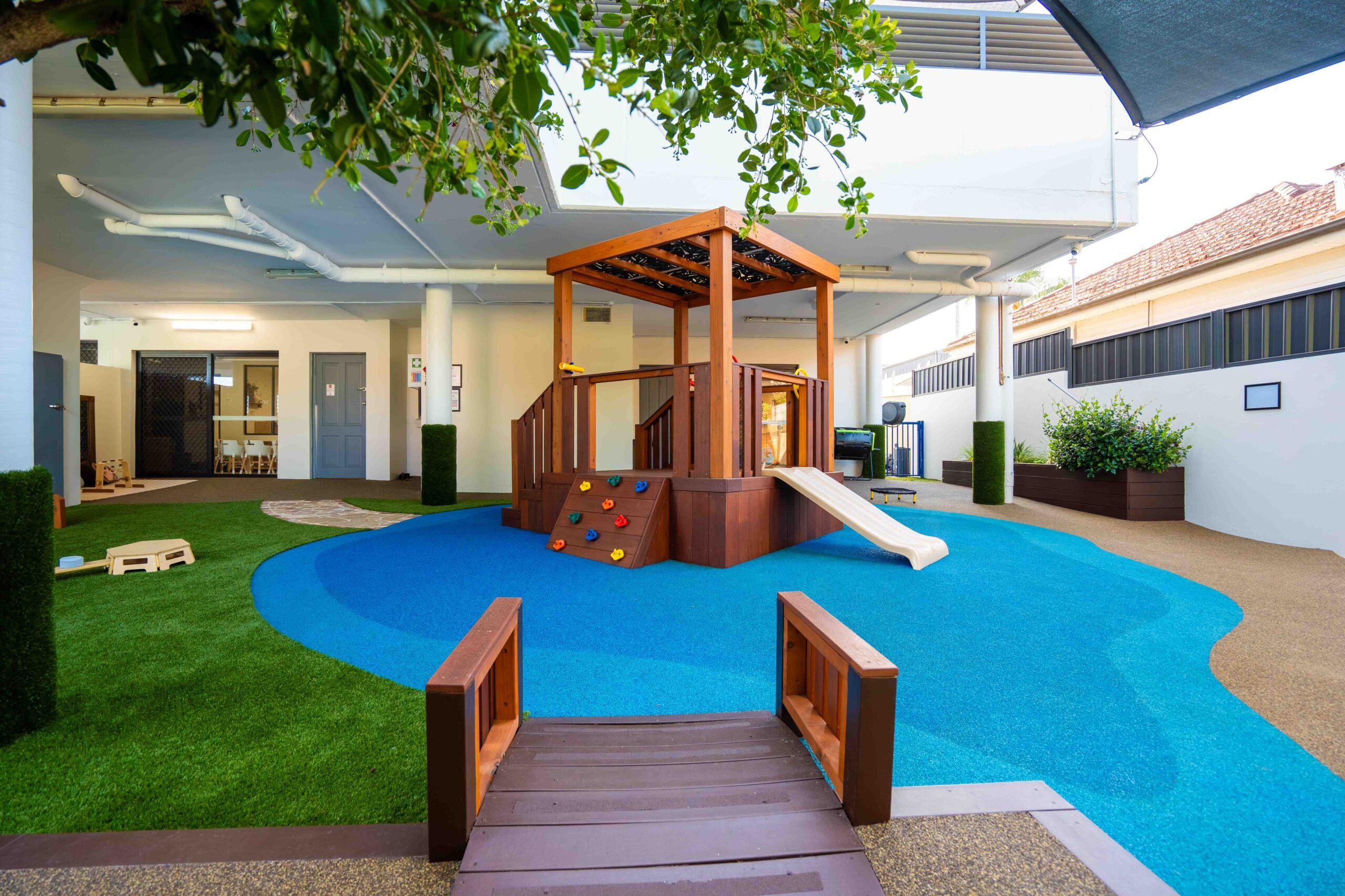 At our Riverwood childcare centre, children enjoy two large outdoor play areas designed to spark curiosity and confidence. The infant space (0–2 years) includes gardens, a sandpit, cubby, climbing equipment, soft play areas, and water play —perfect for safe exploration. The older children’s space (2–6 years) offers climbing equipment, bikes, sandpit, water play, gardens, a dramatic play corner, and an art station.