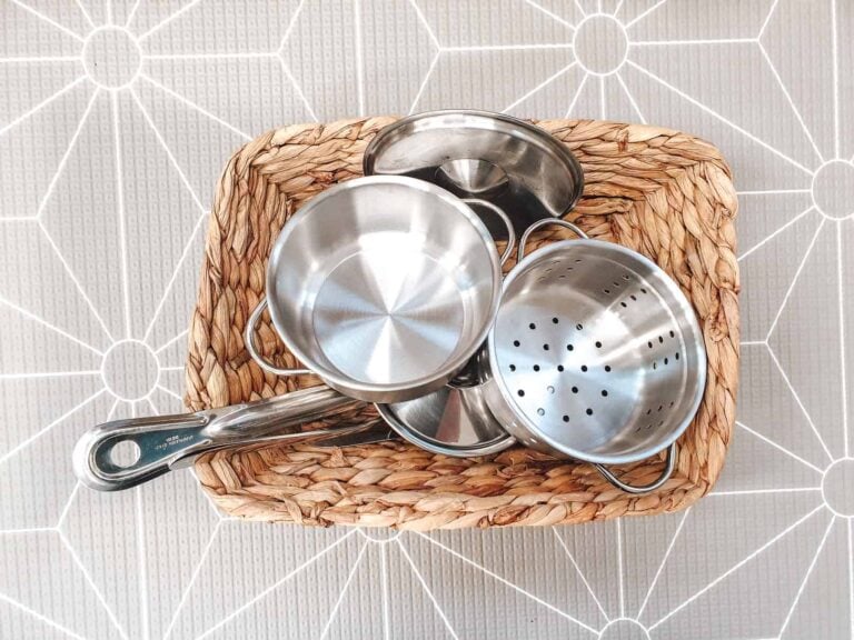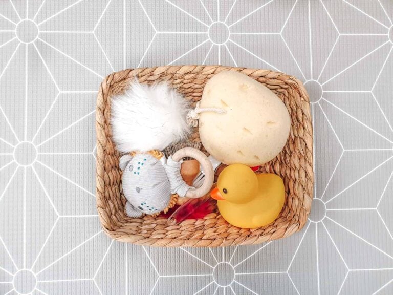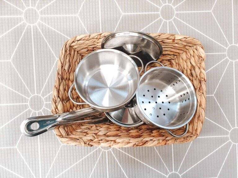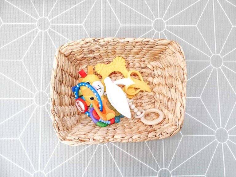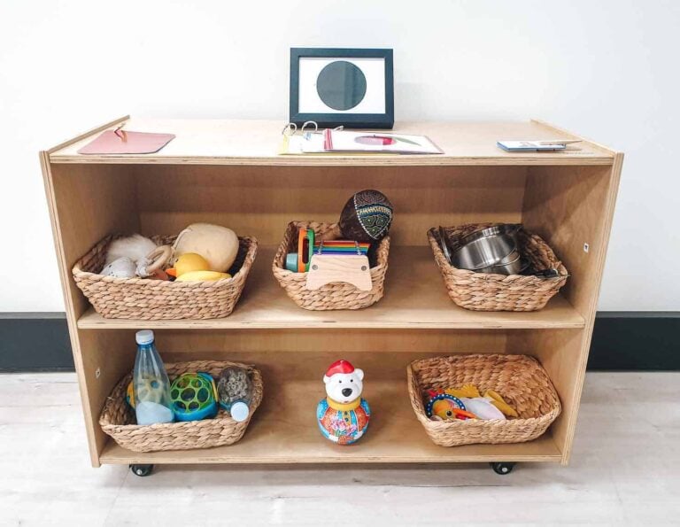 To set up a simple Montessori infant shelf at home, all you need are a few baskets or containers, and some objects from around the house.