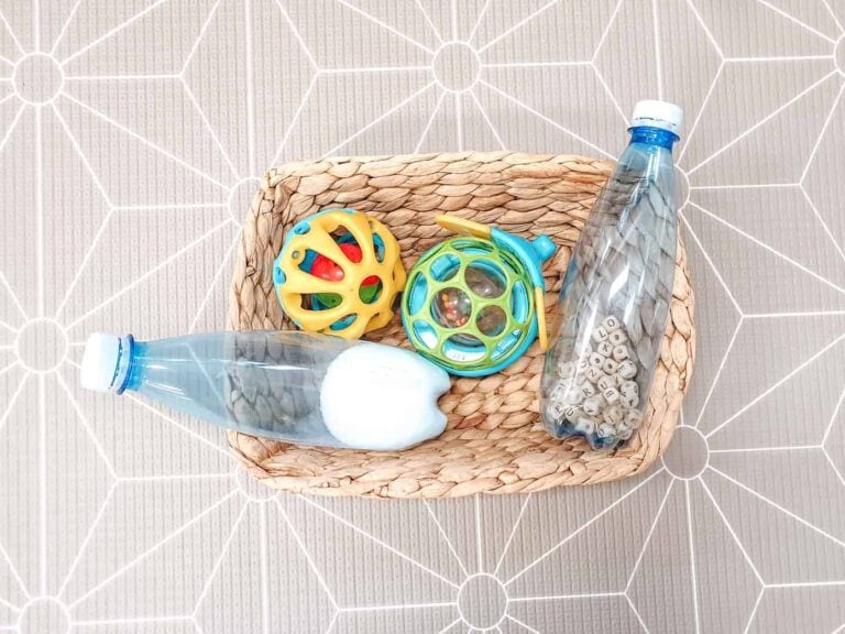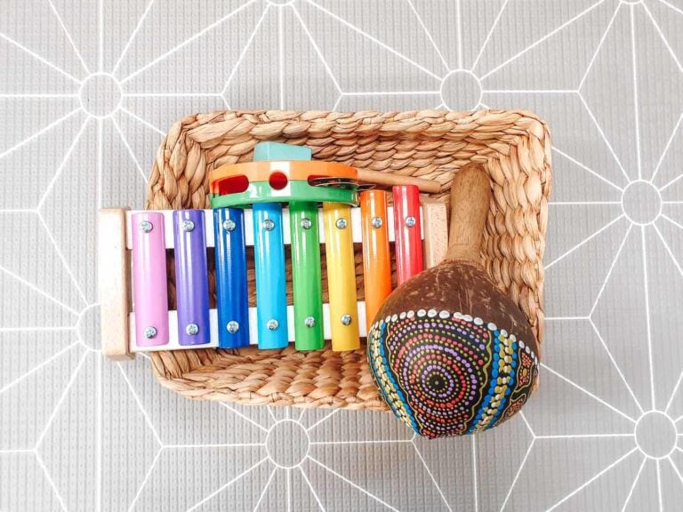Source any items around your home, such as a tambourine, xylophone, and maracas to create a music basket. Infant’s love to explore objects that make different sounds!