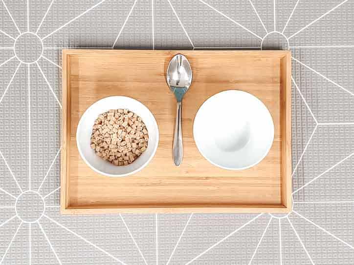 Create your own scooping activities at home by using two bowls, a spoon, a tray, and some dry pasta.