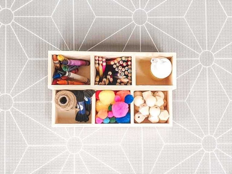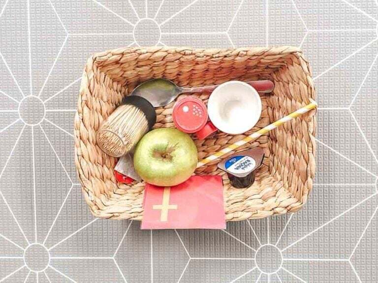 To set up a simple Montessori preschool shelf at home, all you need are a few baskets or containers, the supplied resources, and some objects from around the house.