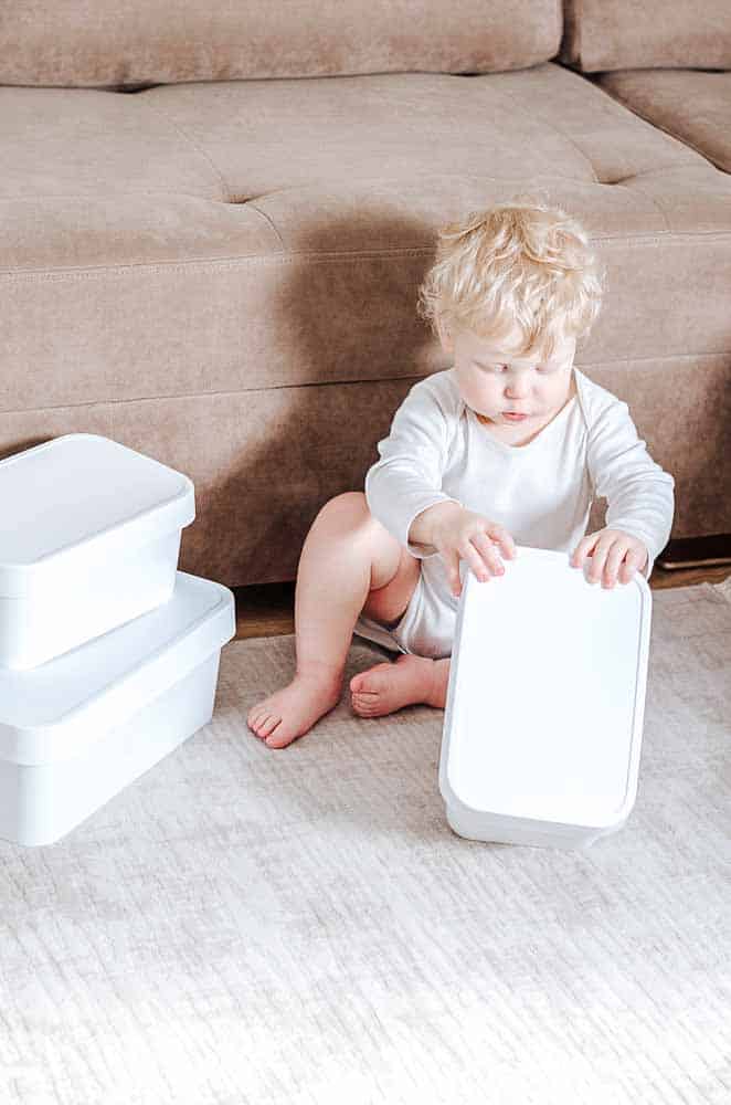 To set up a simple Montessori toddler shelf at home all you need are our resources, a few baskets or containers, and some objects from around the house.
