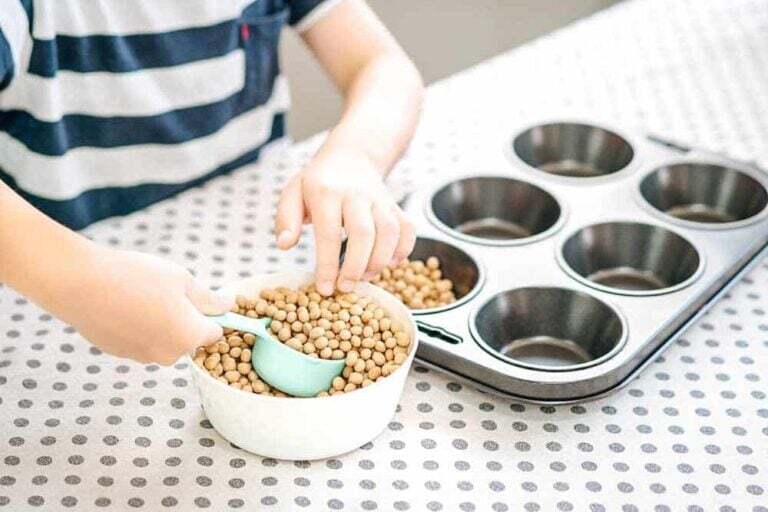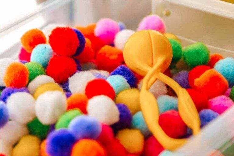 Whole hand transfer is a great activity for children aged 18 months – 3 years to develop their fine motor skills and coordination. All you need is an old tea caddy and pom poms.