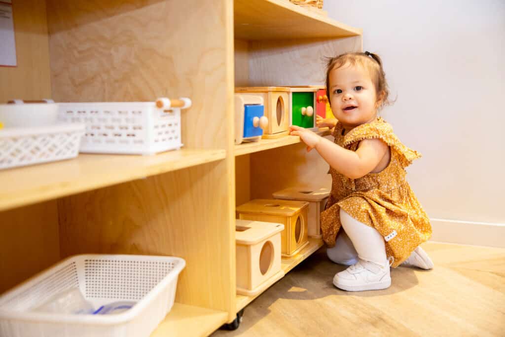 In the prepared environment, the Montessori materials are grouped by their curriculum area, and displayed from left to right in progression order, from easiest to hardest. This logical structure provides a clear pathway for learning.