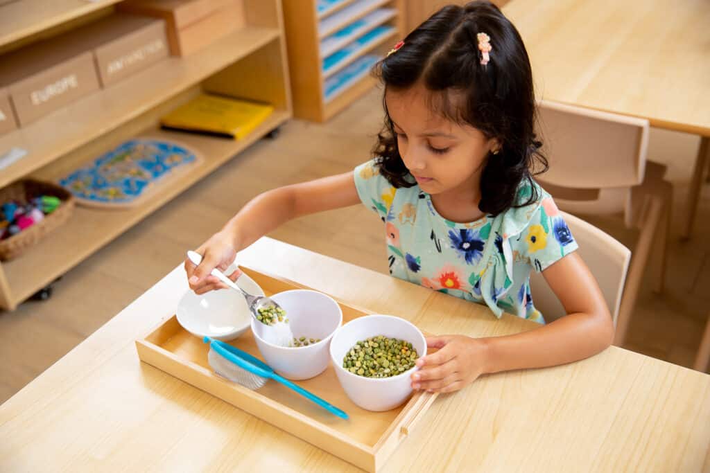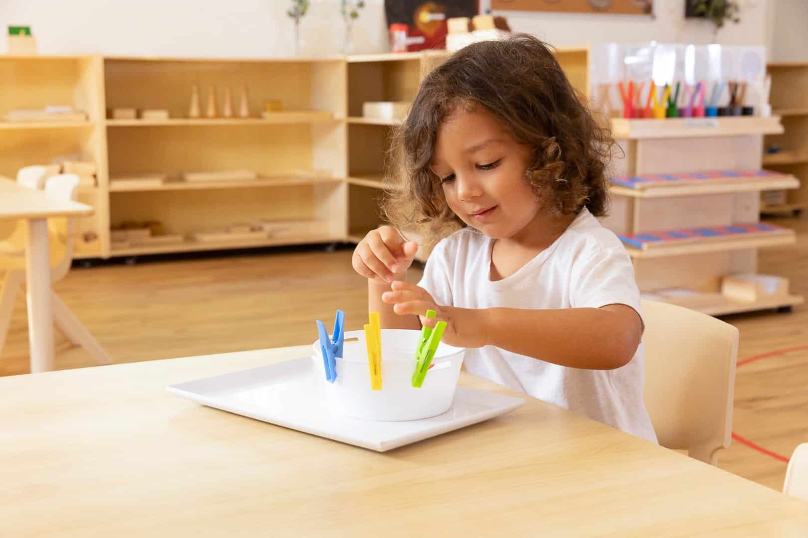 The Montessori classroom is known as the prepared environment because it is purposefully prepared by a trained Montessori educator to create the optimal learning environment for children. The classroom itself is neutral, open-plan, and has a distinct sense of order, beauty and harmony. Everything has a purpose and a place.