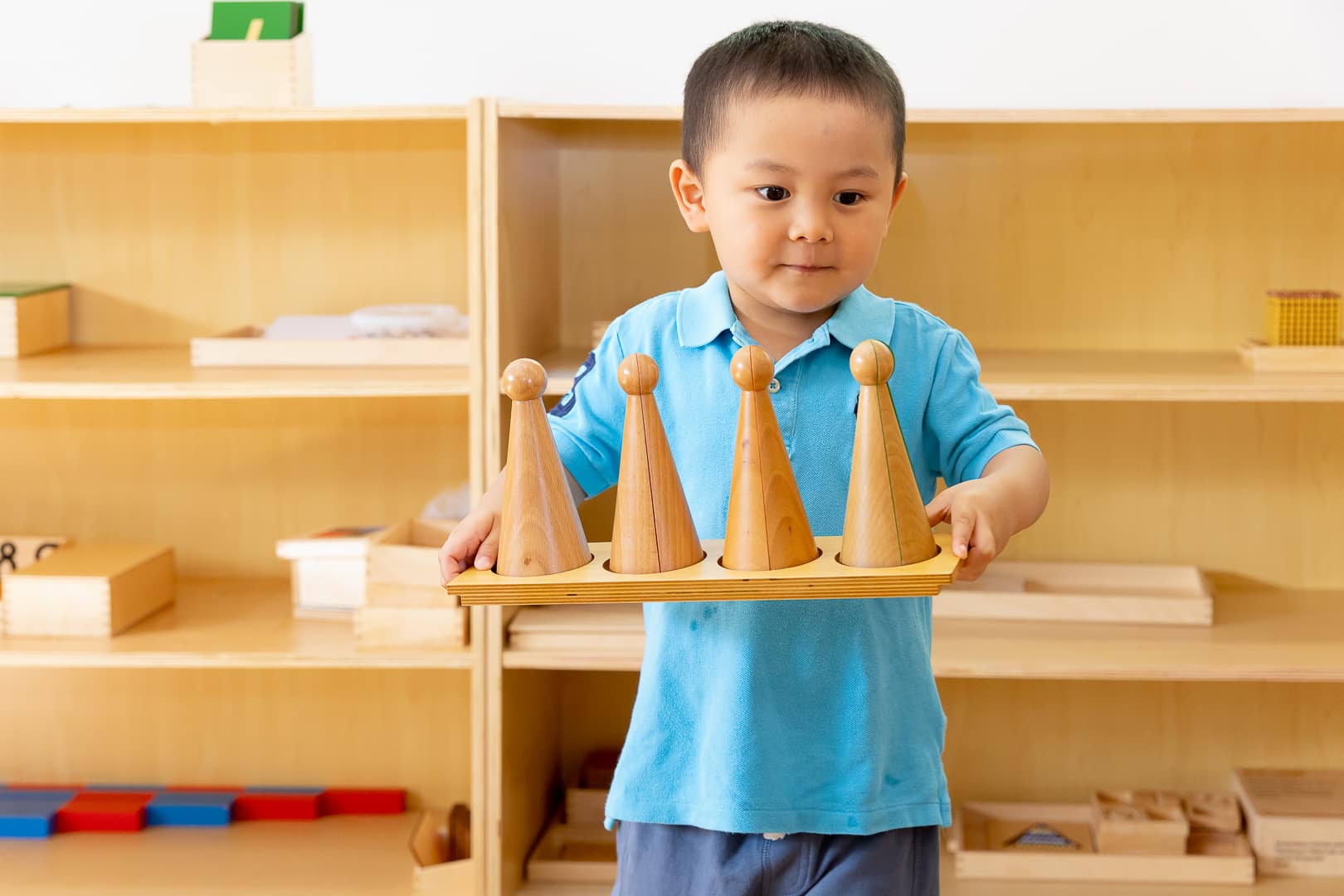 Montessori materials are hands-on learning tools that are designed to provide children with opportunities to discover key learning outcomes through repetition and practice. Each material teaches one skill at a time and is intentionally engineered to support independent learning and problem-solving. The logical progression of the Montessori materials forms the foundation of the Montessori Curriculum.