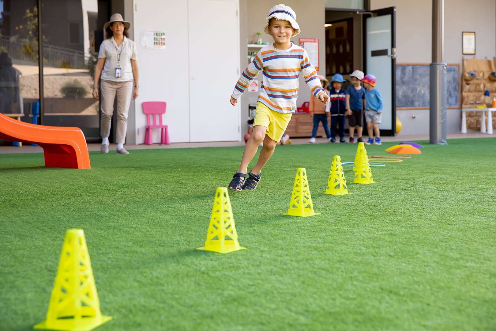 The children then go outside to play and engage in activities that encourage their physical development and fundamental movement skills. Children practice ball skills, running and jumping, play in the sandpit, engage in collaborative play, and participate in games, music, and dancing activities.