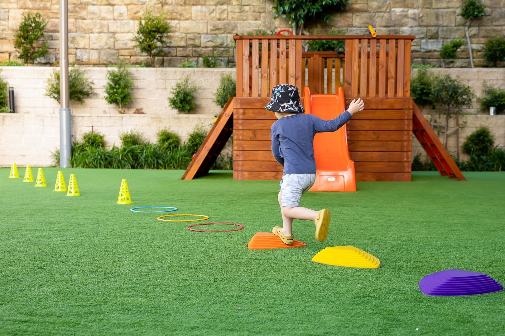 The children then go outside to play and engage in activities that encourage their physical development and fundamental movement skills. Children practice ball skills, running and jumping, play in the sandpit, engage in collaborative play, and participate in games, music, and dancing activities.